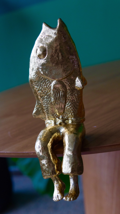 Durval é o peixe que reluz a energia solar das águas do Rio São Francisco. Inteiramente dourado, com aplicação de folha de ouro, ele irradia o brilho que nasce do encontro entre luz e correnteza, como se carregasse na própria pele o reflexo vivo do Velho Chico.